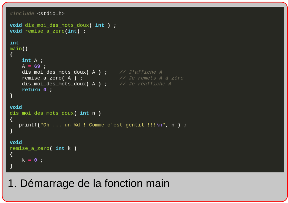 Let’s imagine we write a small program that calls an integer display function, which we will call dis_moi_des_mots_doux: