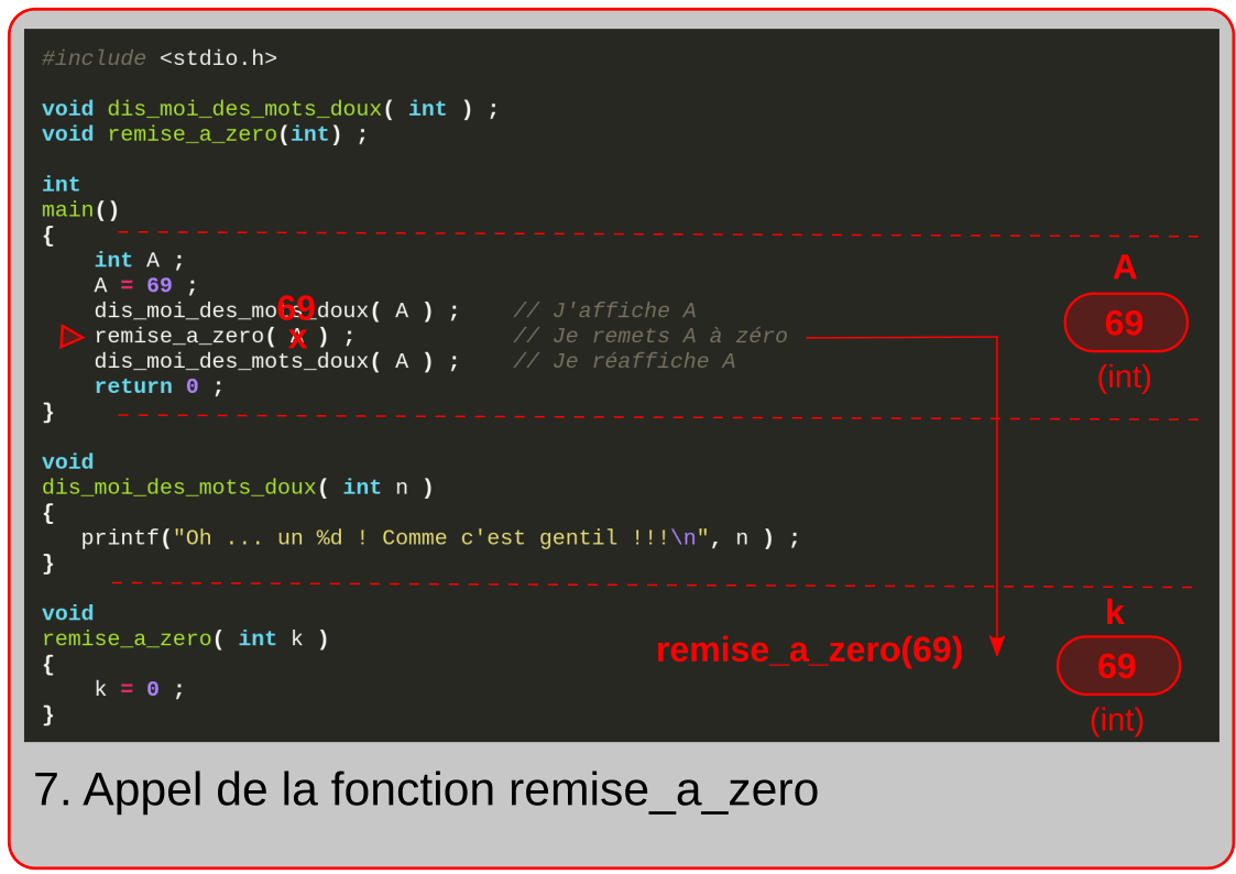 Indeed, since only a copy of the value contained in A is passed to remise_a_zero, the variable A remains unchanged. It cannot work this way! (too hard for us!)