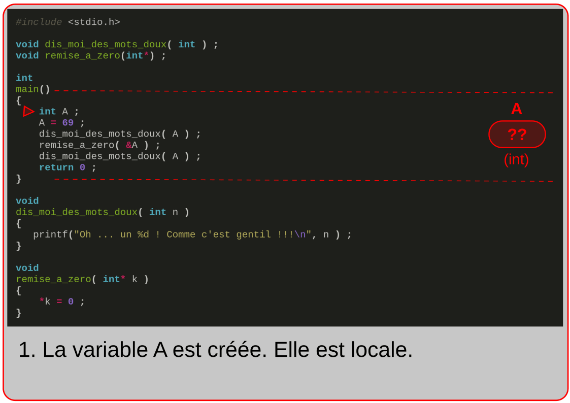 This is where pointers come into play: instead of transmitting A’s value, we will transmit its address, so that the called function knows where to write. And addresses, we manipulate them with this new type of variable that we saw last time: the pointer!
